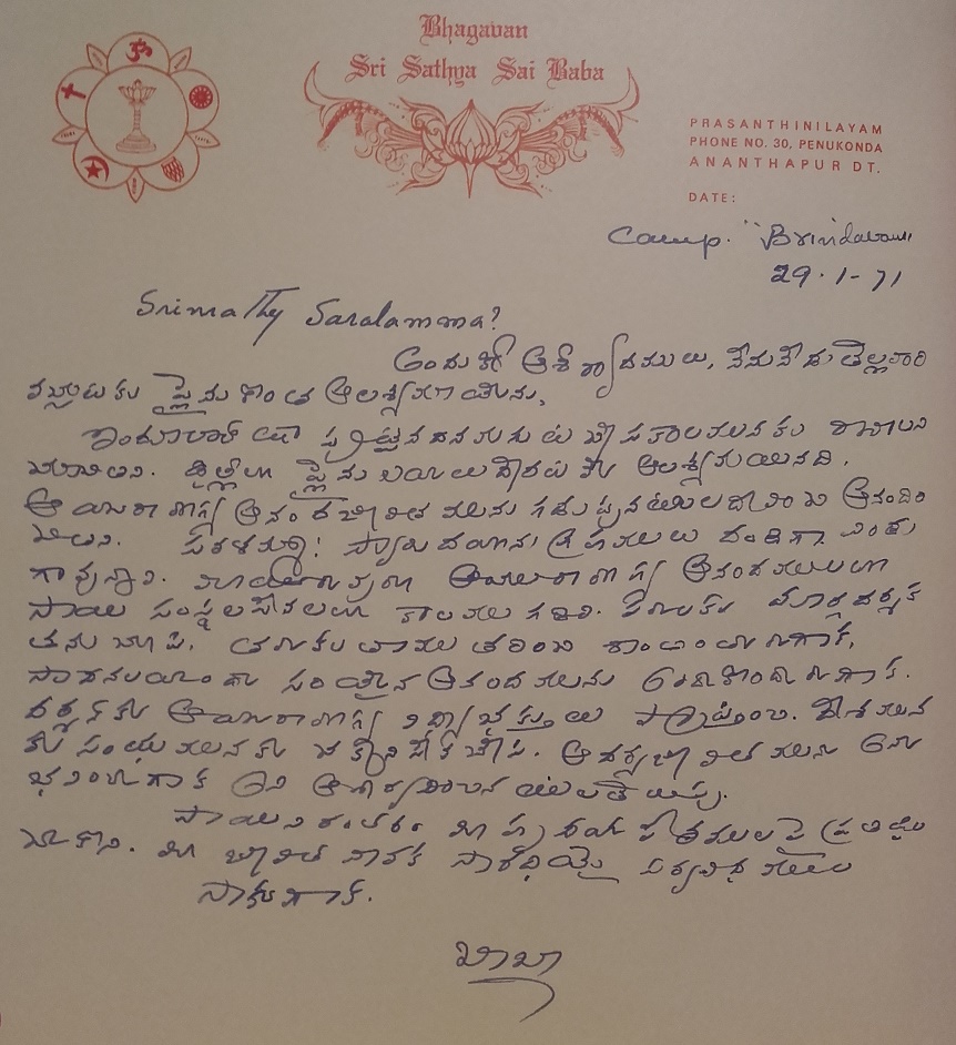 Sarlamma, Swammi's grace, compassion and blessings for you are bountiful. May you both live long with peace and total happiness. May you spend your time as the torch-bearers of the activities of the Sai Organisation. May your life be filled with peace. May you attain complete bliss in your sadhana.