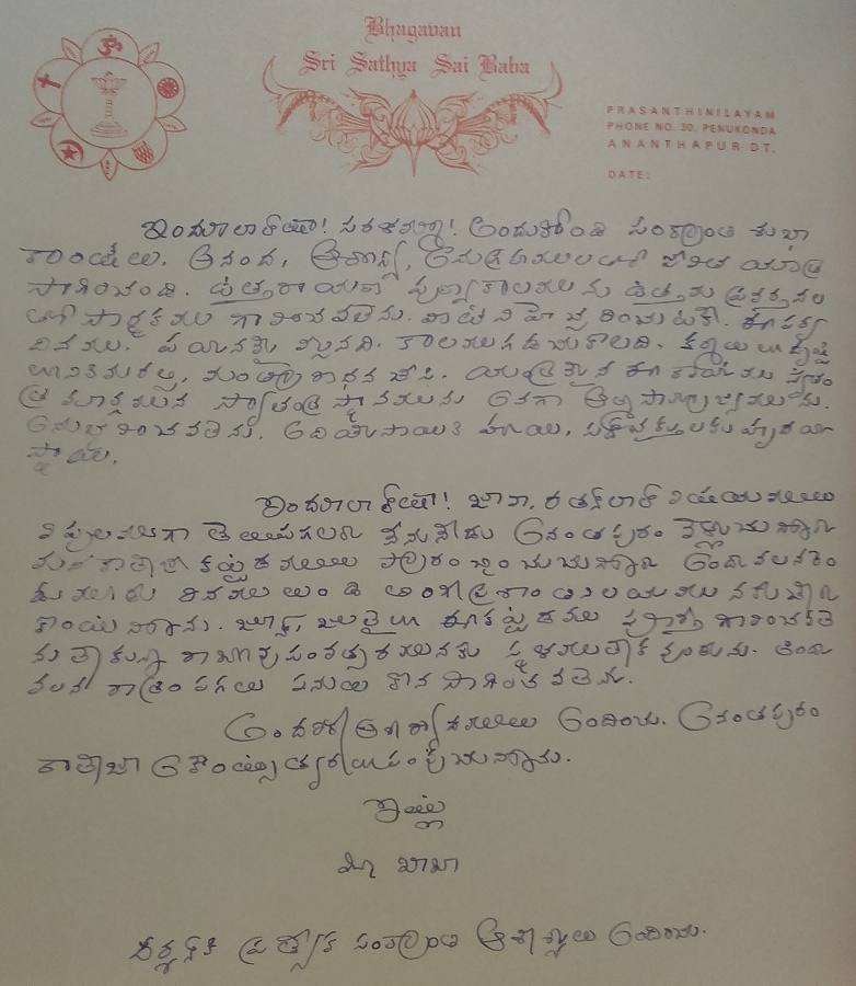 Indulal Shah, the details of all the activities appening here will be conveyed in detail by Java and Ratanlal. I am going to Anantapur today to start the construction of our college building. I will be there for two days and then return to Prashanti Nilayam. The construction work has be to completed by June or July; only then will the land granted to us continue to be under our ownership. Therefore, work has to continue day and night.
